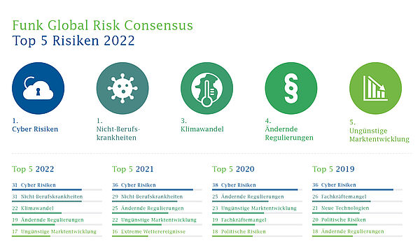 Im 5. Funk Global Risk Consensus rangieren wie bereits in den Vorjahren die Cyberrisiken auf dem ersten Platz. Dieser Platz muss jedoch im Jahr 2022 mit dem Risiko "Nicht-Berufskrankheiten" geteilt werden. Der Grund: Experten bewerten die negativen Auswirkungen der Corona-Pandemie weiterhin als bedeutend. An dritter Stelle unter den Top-Risiken folgen die Auswirkungen des Klimawandels, nachdem Stürme, Hochwasser und Dürren im letzten Jahr weltweit für verheerende Schäden gesorgt haben.