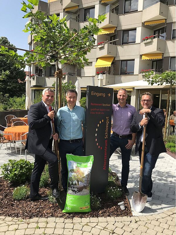Anlässlich ihres 140. Geburtstags unterstützt die Funk Gruppe ein Aufforstungsprojekt in Myanmar und leistet dabei einen wertvollen Beitrag für den Klimaschutz. Ein symbolisches Zeichen wurde auch bei der Übergabe der neu eröffneten Gartenterrasse des Alterszentrums Schlossgut in Münsingen gesetzt - vier Schirm-Platanen sorgen nun für reichlich Schatten.