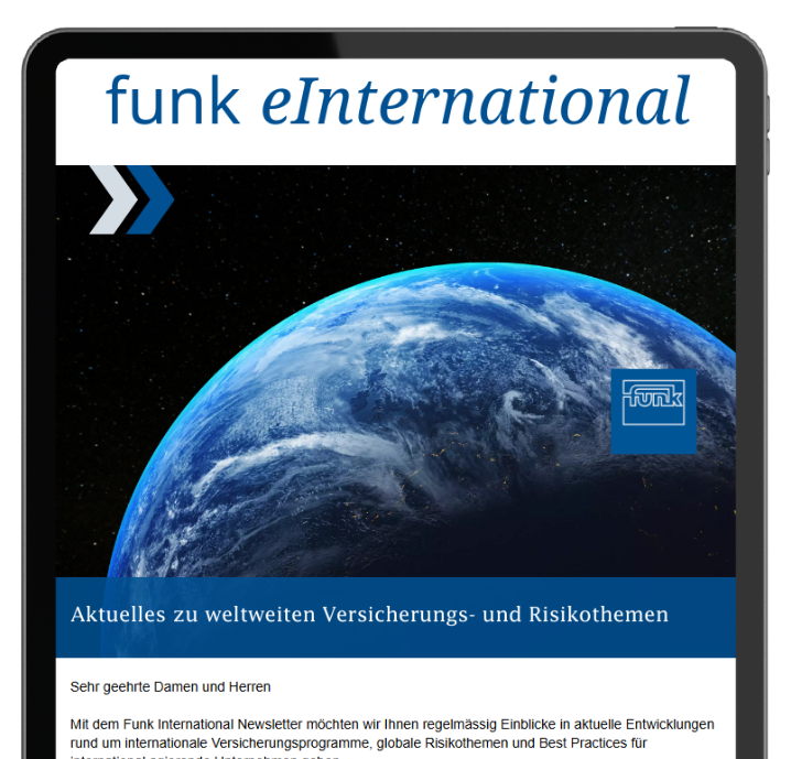 In unserem Funk eJournal finden Sie Aktuelles aus dem Versicherungs- und Risikomanagement wie auch der Vorsorge – direkt aus der Funk-Welt. Der Newsletter zum gesamten Leistungsspektrum erscheint zwei Mal im Jahr.