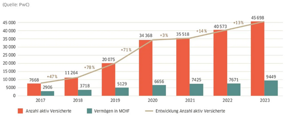 Mit der Änderung des Freizügigkeitsgesetzes im Jahr 2017 gewannen 1e-Pläne an Attraktivität und es kam Bewegung in den 1e-Markt. Dieser verzeichnet seither ein konstantes und stabiles Wachstum. Die Grafik „1e-Marktentwicklung“ zeigt das ansehnliche Wachstum der letzten Jahre sowohl bei der Anzahl der Versicherten wie auch bei der Zunahme des investierten Vorsorgevermögens auf. Bei einem geschätzten Marktpotential von rund 530‘000 Versicherten sind mit den rund 46‘000 Versicherten erst rund 9% vom Potential abgedeckt. Deshalb gehen verschiedene Marktteilnehmer von einem jährlichen Wachstum zwischen 15 und 20% über die nächsten Jahre aus. Funk teilt diese Ansicht und rechnet damit, dass sich die positive Entwicklung, gem. Grafik, im gleichen Rahmen fortsetzen wird.