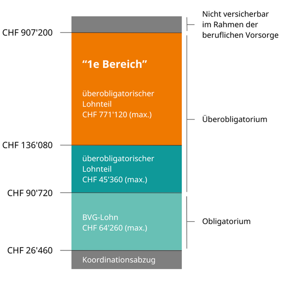 Über 1e-Vorsorgepläne dürfen ausschliesslich Lohnanteile über dem anderthalbfachen oberen Grenzbetrag gemäss Art. 8 Abs. 1 BVG – derzeit CHF 136‘080 versichert werden. 1e-Lösungen erlauben es den Versicherten, ihre Anlagestrategie selbst zu wählen und somit ihre Vorsorgegelder nach ihren persönlichen Präferenzen und Risikoprofilen anzulegen. Die Versicherten profitieren direkt von einer allfälligen Rendite, tragen aber auch das Anlagerisiko.