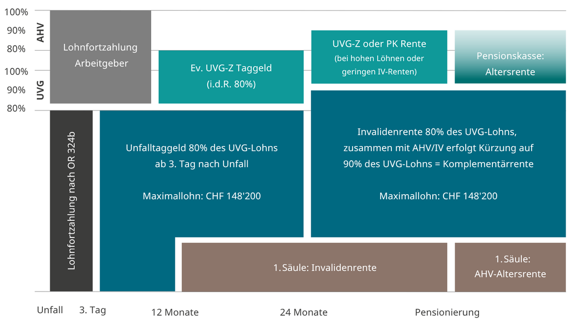 UVG (obligatorisch): Versichert Berufsunfälle und Nichtberufsunfälle, zahlt z.B. 80% des versicherten Lohnes als Invalidenrente (max. bis CHF 148’200 [Jahr 2025]).