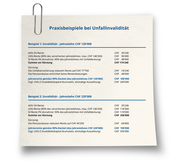 - Gesetzlich koordinierte Systeme (AHV/IV, UVG, BVG oblig.) verhindern Überentschädigungen. Die Summe darf i.d.R. 90% des mutmasslich entgangenen Verdienstes nicht überschreiten. Eine Überentschädigung kommt weniger im Krankheitsfall als bei Unfall zum Tragen, weil im Krankheitsfall meist tiefere Leistungen ausgerichtet werden.