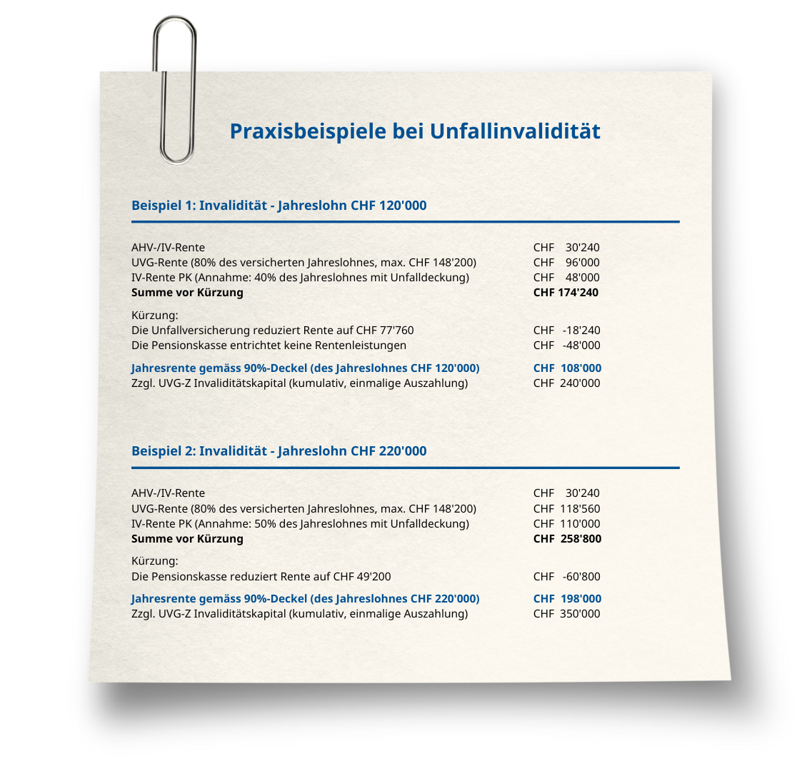 - Die Leistungskoordination zwischen Pensionskasse, UVG- und UVG-Zusatzversicherung ist regelmässig zu prüfen. Oftmals helfen konkrete Simulationen, wie die Koordination in der Praxis mit einzelnen Trägern wirkt. Transparenz verhindert falsche Erwartungen.