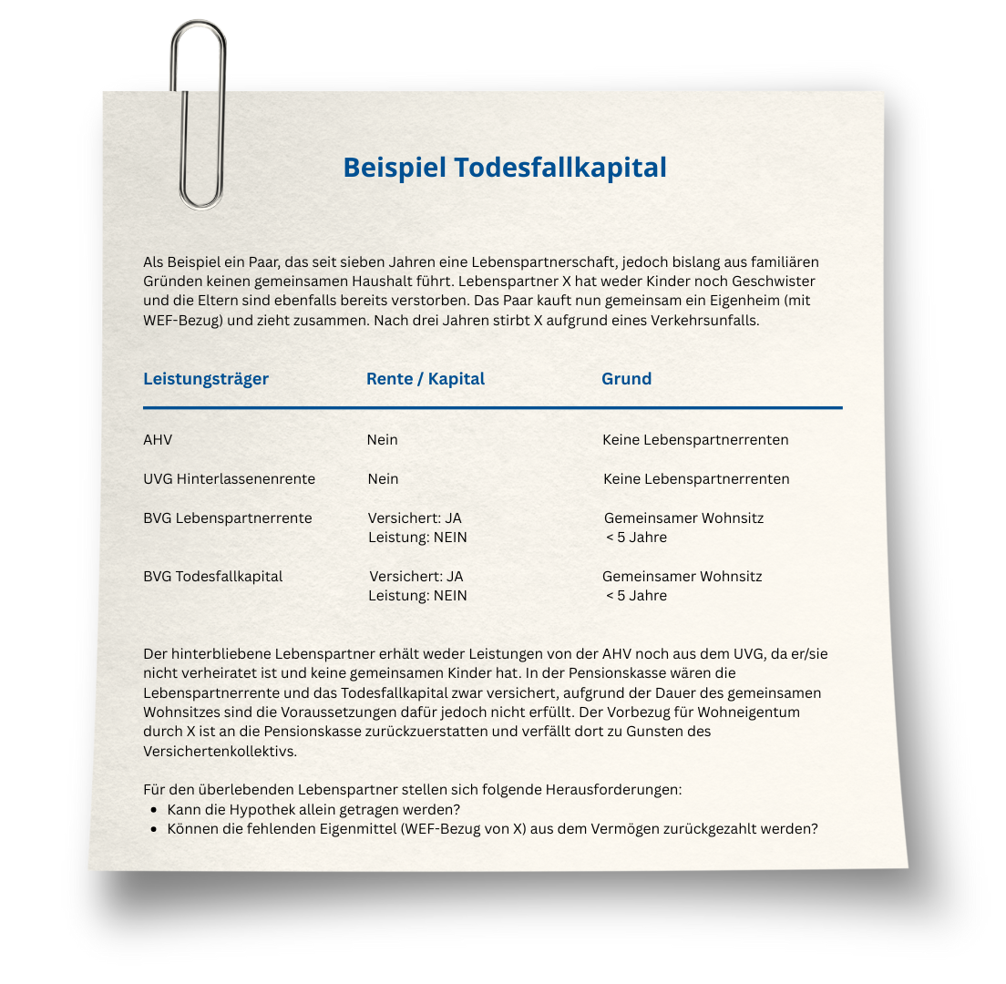 Die gesetzliche Praxis ist kritisch zu hinterfragen. Eine Ausdehnung und Erweiterung des Kreises der begünstigten Personen für das Todesfallkapital auf eine Lebenspartnerschaft, ohne die bereits beschriebenen Voraussetzungen, wäre wünschenswert. Die notwendige Gesetzesanpassung würde zudem den heutigen Gesellschaftsnormen eher gerecht werden. Die Rückzahlung des Todesfallkapitals (sowohl des vorhandenen Altersguthabens wie auch eines allfälligen zusätzlichen Todesfallkapitals) wäre für die Pensionskassen finanziell verkraftbar bzw. müsste in der entsprechenden Prämie einkalkuliert werden.