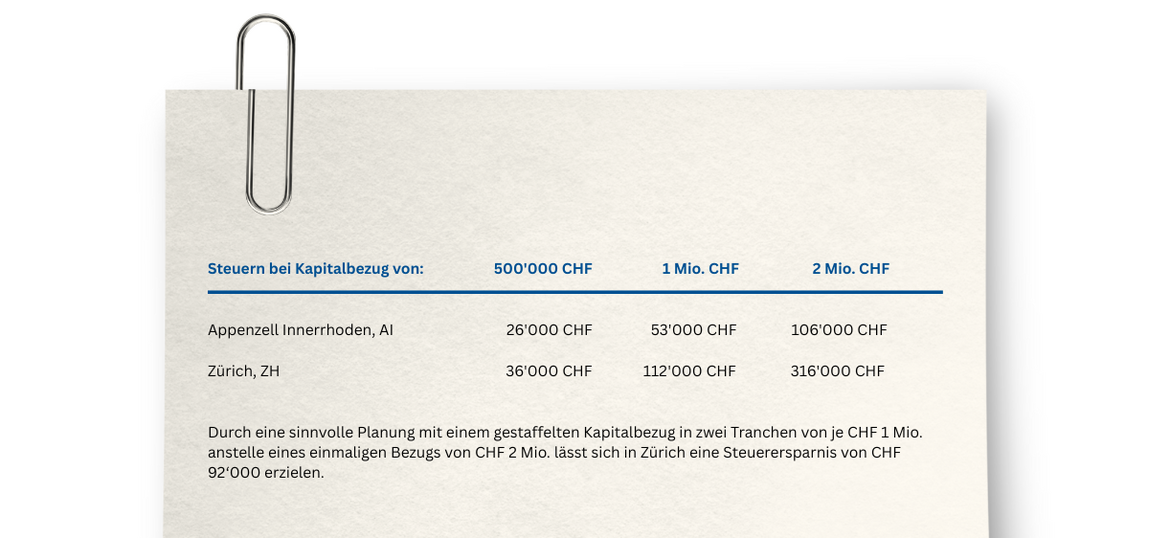 Gemäss aktueller Steuergesetzgebung darf der Kapitalbezug aus der beruflichen Vorsorge (2. Säule) in maximal drei Etappen erfolgen. Weitere Pensionierungsschritte müssen zwingend in Rentenform bezogen werden. Zudem werden Kapitalauszahlungen aus der gebundenen Selbstvorsorge (Säule 3a) und der beruflichen Vorsorge (Säule 2), die im selben Kalenderjahr erfolgen, für die Besteuerung zusammengezählt.